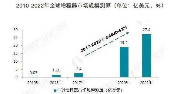 全球增程器市场规模已从2010年的0.07亿美元增长至2016年的1.41亿美元。按照提出的2020年需要销售760万辆电动汽车的目标来看,全球增程器行业增长空间巨大,预计到2022年,行业市场规模将超过27亿美元,年均复合增长率在62%左右。